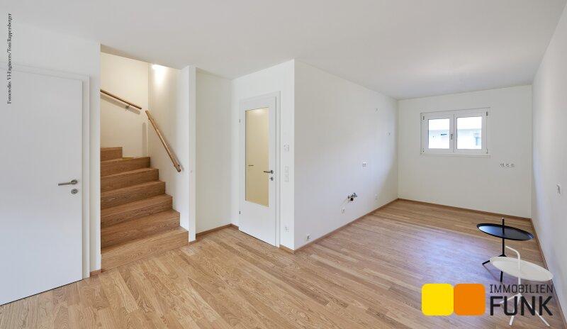 Vom überdachten Zugangsbereich der Liegenschaft betreten Sie den Vorraum (ca. 7,06 m²), der genügend Platz für eine Garderobe bietet. Rechter Hand finden Sie den Haustechnikraum (ca. 3,44 m²) samt hauseigener Wärmepumpe. Angrenzend ist die Toilette (ca. 2,31 m²) mit Handwaschbecken vorgesehen. Linker Hand führt Sie eine Innentreppe in die oberen zwei Geschoße. Weiter geradeaus gelangen Sie direkt in die offen konzipierte Wohnküche (ca. 35,36 m²), wobei linker Hand ein Abstellraum (ca. 3,52 m²) unterhalb der Stiege konzipiert ist. Von der ansprechenden Wohnküche gelangen Sie zur südseitig ausgerichteten Terrasse (ca. 13,38 m²) und einem gemütlichen Garten (16,49 m²) mit eigener Gartenhütte.