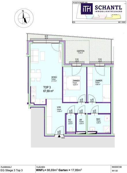 Wohnfläche: ca. 66,69 m² + Garten: ca. 18 m² + Kellerabteil