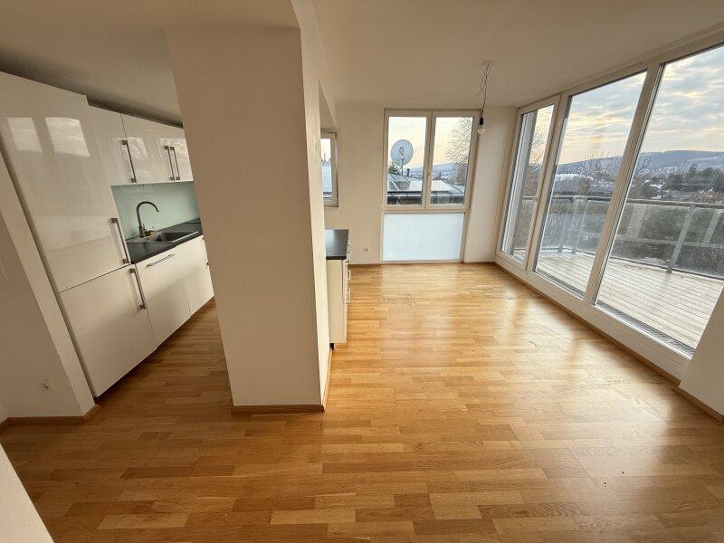 Hier befindet sich ein großzügiges Wohnzimmer mit offener Küche und Ausgang auf die große Terrasse mit unverbaubarem Fernblick. Die Terrasse lädt zum Verweilen und Sonnen ein.
