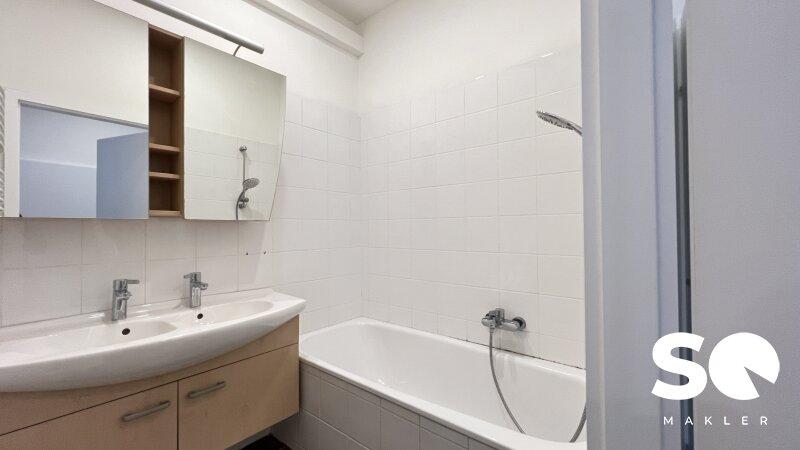 Das Badezimmer ist mit einer Badewanne und einem Handwaschbecken ausgestattet. Ein separates WC sorgt für zusätzlichen Komfort. Ein weiterer Pluspunkt ist der Abstellraum, der über einen Waschmaschinenanschluss verfügt und ausreichend Stauraum bietet.