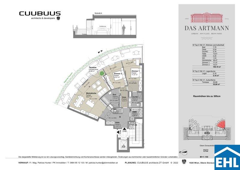 In den Regelgeschoßen entstehen Wohnungen mit einer Wohnnutzfläche von 41 m² bis 132 m², in den Dachgeschoßen finden sich Einheiten zwischen 41 m² und 166 m², bis hin zu den vier Penthäusern: zwei mit jeweils 153 m² (+ 85 m² Terrasse), zwei mit jeweils 288 m² Wohnnutzfläche (+ 120 m² Terrasse).  Das Erdgeschoß ist für Gewerbe vorgesehen.