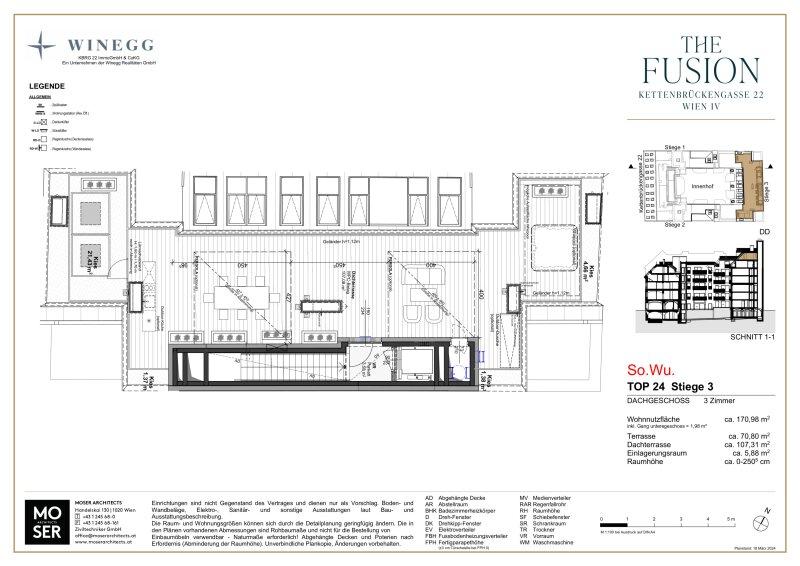 Mit dem Lift gelangt man direkt in den Vorraum des Penthouses, an den die geräumige Wohnküche mit über 71 qm angrenzt. Zu beiden Seiten dieses außergewöhnlichen Dachgeschoßes befindet sich eine Terrasse mit je ca. 35 qm, welche vom Wohnraum sowie die zwei Schlafzimmer zu begehen sind. Des Weiteren bietet dieses Objekt zwei Bäder, zwei Toiletten und einen Abstellraum. Die Raumhöhe beträgt ca. 2,52 m.