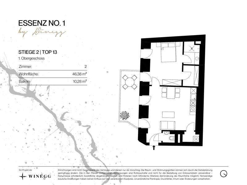 Die 2-Zimmer-Wohnung befindet sich im 1. Obergeschoss und bietet eine Wohnfläche von ca. 46 m² und einen Balkon mit ca. 10 m². Die Raumaufteilung gliedert sich wie folgt: