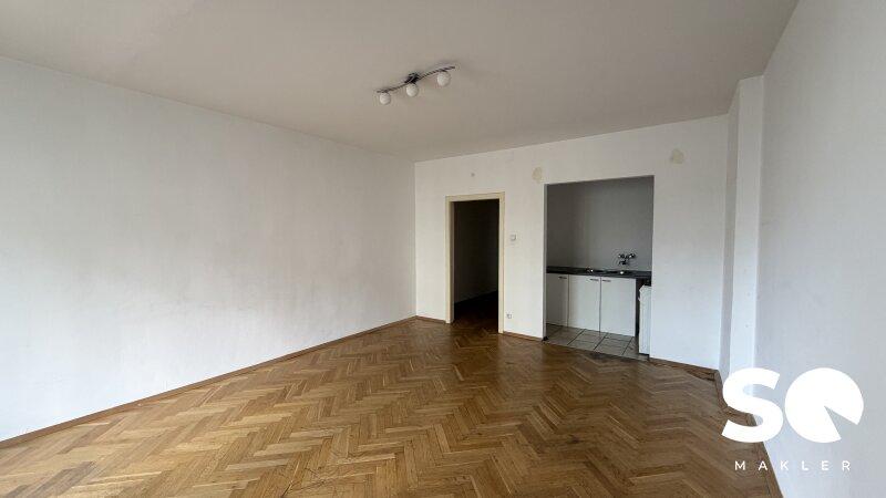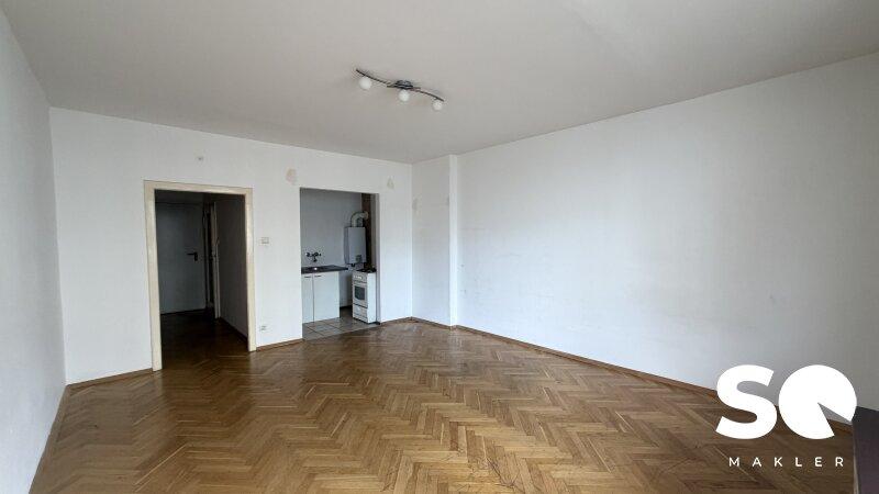 Auf einer Wohnfläche von ca. 37 m² bietet die Wohnung ein großzügiges Wohn-/Schlafzimmer mit ca. 22 m², das vielfältige Gestaltungsmöglichkeiten eröffnet. Vom Wohnbereich aus ist eine praktische Kochnische integriert, die den Raum optimal nutzt.