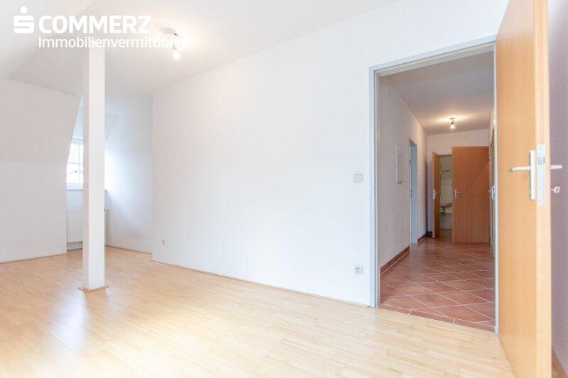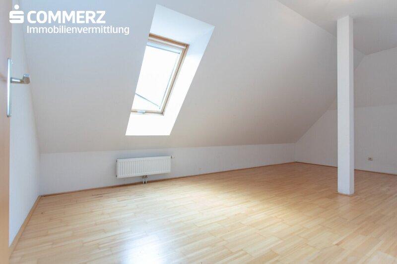 Im unteren Wohnbereich erwartet Sie ein helles Wohnzimmer mit integrierter, unmöblierter Kochnische sowie ein Zimmer, das sich ideal als Schlafzimmer oder Homeoffice eignet. Ergänzt wird diese Ebene durch einen Vorraum, ein sehr nettes Badezimmer mit Badewanne, Dusche und Waschmaschinenanschluss, ein separates WC sowie einen praktischen Abstellraum.