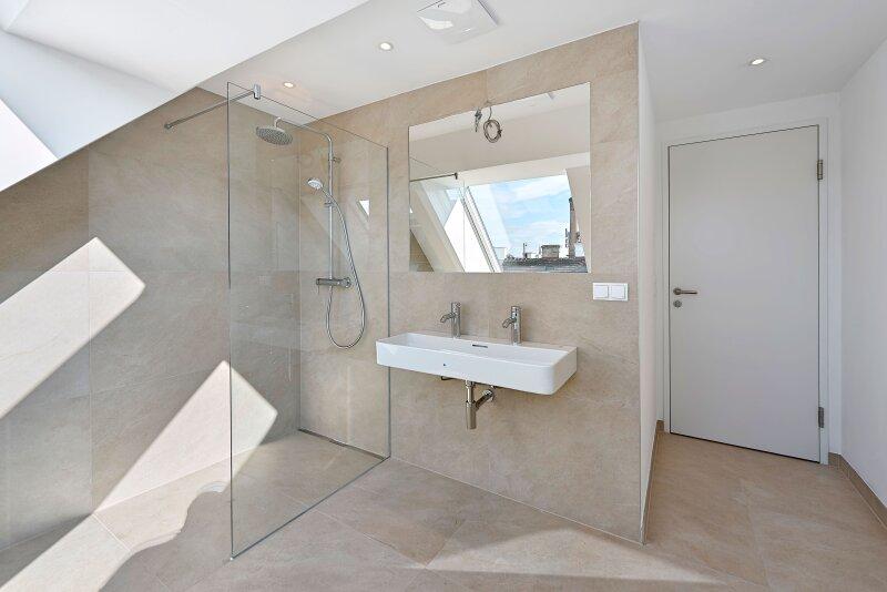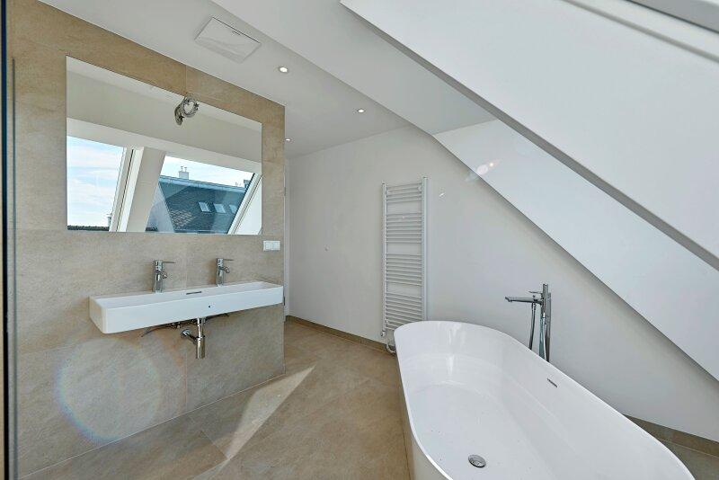 Vom Vorraum mit versteckter Garderobe bzw. Abstellraum gelangt man in das edle und luxuriöse Badezimmer mit freistehender Badewanne, ebenerdiger Dusche und einem Doppelwaschtisch. Mit den pompösen Dachfenstern wirkt das Badezimmer noch stilvoller und ist ein echtes Highlight der Wohnung.
