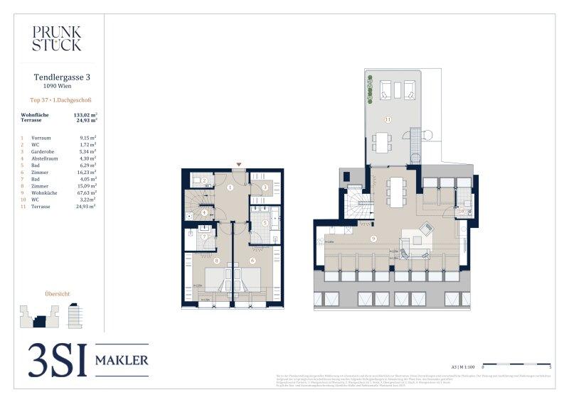Diese stilvolle Dachgeschosswohnung Top 37 erstreckt sich über zwei Ebenen und bietet mit einer Wohnfläche von 133,02 m² sowie einer großzügigen Terrasse mit 24,93 m² ein durchdachtes und elegantes Wohnkonzept in zentraler Lage.