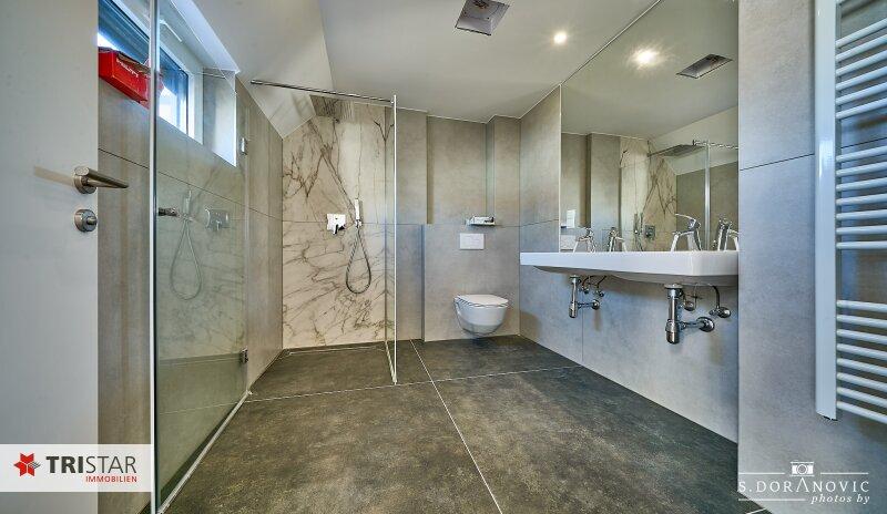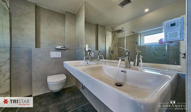 - Sanitär: Fußbodenheizung in Bädern, Wand-WC (Tiefspüler), Handwaschbecken (43x34 cm), Waschtisch (120x46 cm), Chrom-Armaturen, Duschkopf, Mischer, Handbrause.