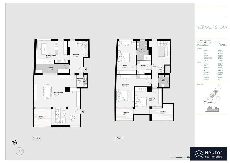 Diese stilvolle 5-Zimmer-Maisonettewohnung im 2. Stock eines modernen Wohnhauses im 19. Bezirk vereint luxuriöses Wohnen mit großzügiger Raumgestaltung und absoluter Privatsphäre. Mit ca. 227,61 m² Wohnfläche, zwei Terrassen und einer Loggia bietet sie ein einzigartiges Wohnambiente. Direkter Liftzugang, lichtdurchflutete Räume und ein nachhaltiges Energiekonzept machen diese Wohnung zu einem exklusiven Rückzugsort.