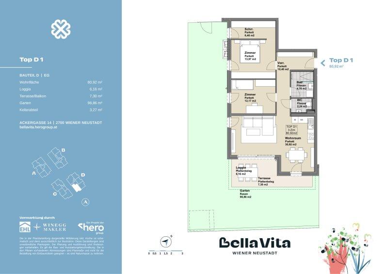 Die 3-Zimmer-Wohnung ist im Erdgeschoss gelegen und bietet eine Wohnfläche von ca. 80,92 m² sowie eine Loggia mit ca. 6,16 samt Terrasse mit ca. 7,30 m² und einen großzügigen Garten mit ca. 98,86 m².