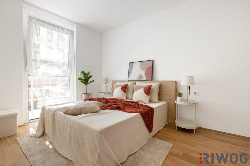 Bei den gezeigten Bildern handelt es sich einerseits um Visualisierungen, andererseits um Fotos der Musterwohnung (Bauteil Ottakringer Straße, Top 1/6) mit gleicher Ausstattung.