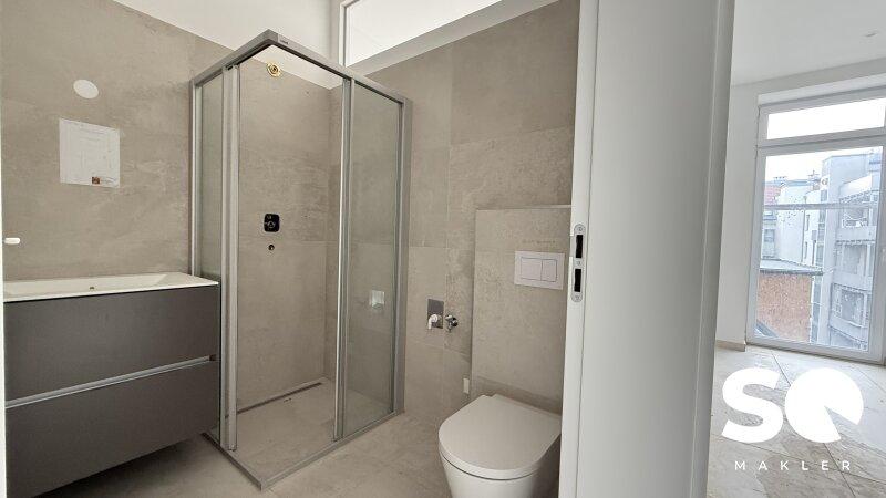 Das Badezimmer ist mit einer modernen Dusche ausgestattet und verfügt über Waschmaschinenanschluss, WC und Handwaschbecken. Dank neuer Fenster genießen Sie angenehme Lichtverhältnisse und ausgezeichnete Wärmedämmung, während Sie den Altbaucharakter in vollen Zügen erleben können.