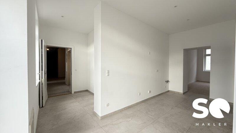 Der großzügige Wohnbereich mit seinen wunderschönen Eichendielen und die hohen Decken schaffen eine behagliche Atmosphäre, die den Charme der Jahrhundertwende perfekt zur Geltung bringt. Die stilvollen italienischen Großflächenfliesen im Bad setzen moderne Akzente und harmonieren mit den hochwertig ausgewählten Armaturen. Die Küche ist für das Vorzimmer geplant.