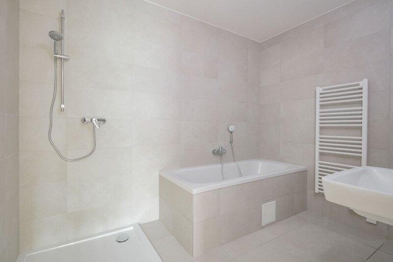 - Badezimmer mit Badewanne, Dusche, Handwaschbecken und WM-Anschluss