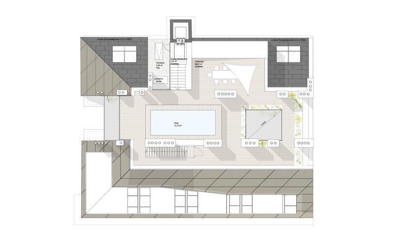 Das eigentliche Highlight liegt jedoch darüber: Ein Knopfdruck und man gelangt auf die ca. 140 m² große Dachterrasse mit eigenem Pool (bereits bewilligt). Ein privater Horizont über der Stadt.