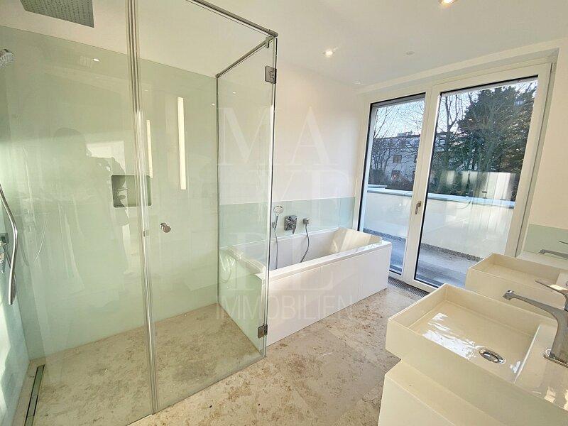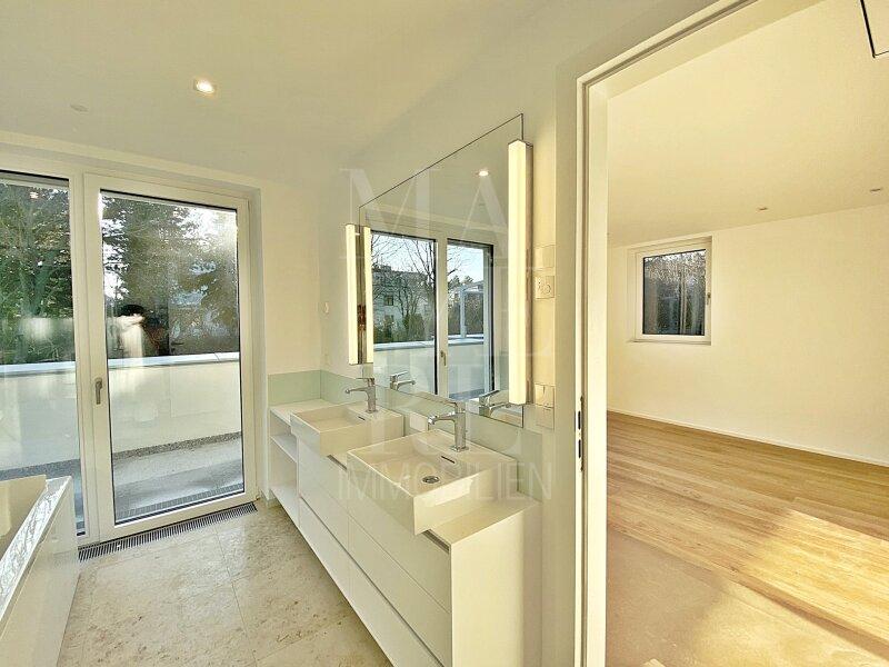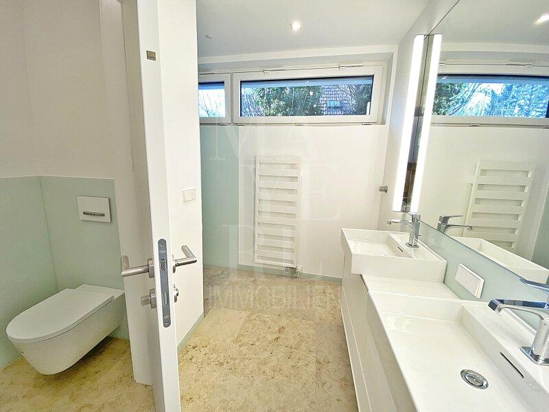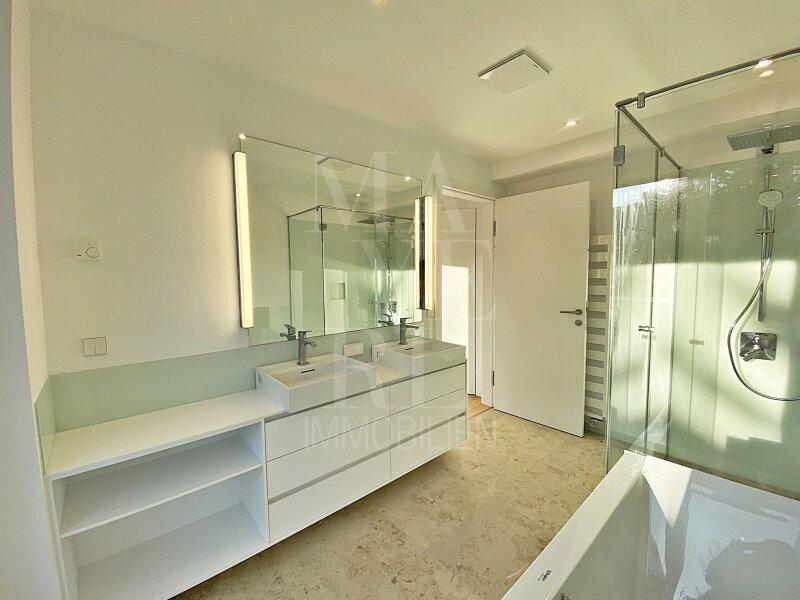 - Masterbedroom mit Ausgang auf die gartenseitige Terrasse und ensuite Schrankraum und Badezimmer (Badewanne, Dusche, Doppelwaschbecken), separate Toilette