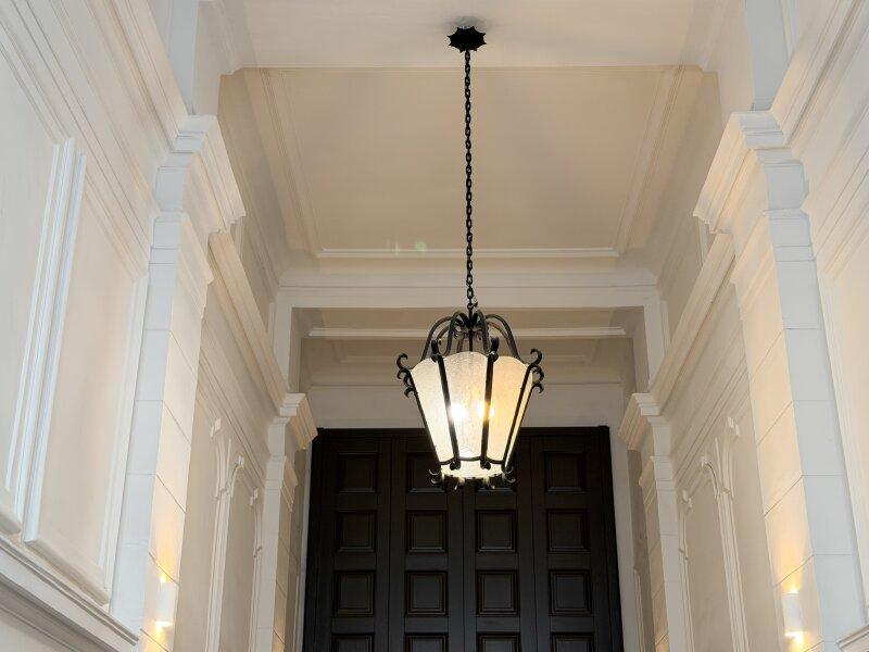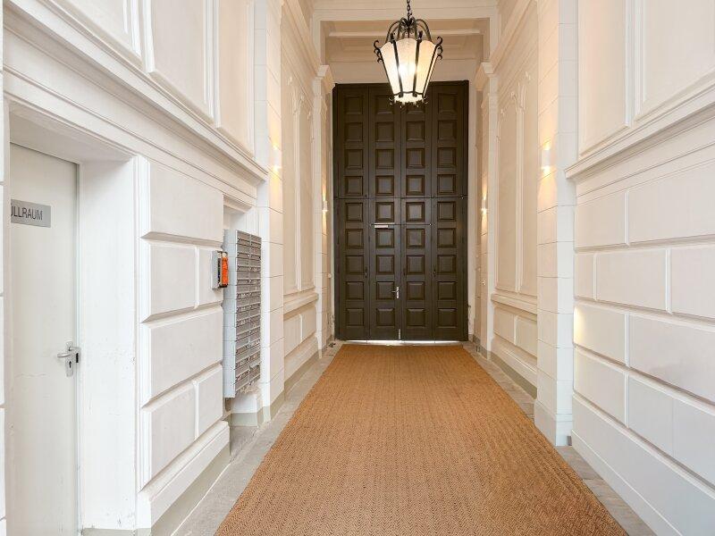 Eingebettet in einen gepflegten Altbau mit klassischer Fassadengestaltung, empfängt Sie das Haus mit einem großzügig gestalteten Eingangsbereich, der durch seine Offenheit und das markante Tor einen bleibenden ersten Eindruck hinterlässt.