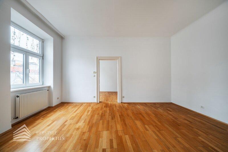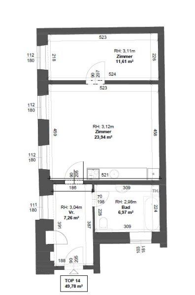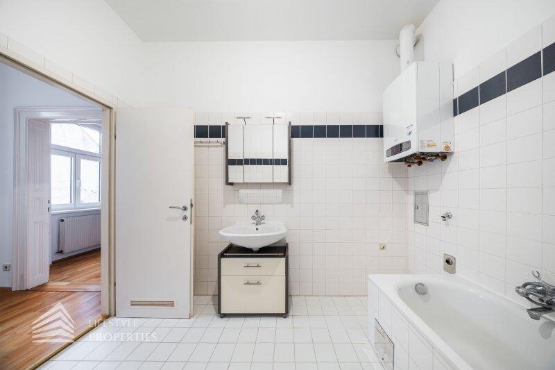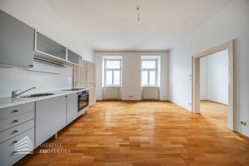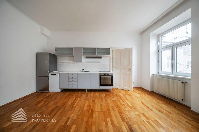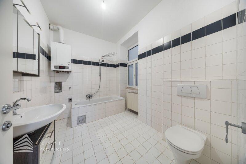 Beim Betreten gelangt man in einen rund 7 m² großen Vorraum, der ausreichend Platz für Garderobe und Stauraum bietet und alle Räume zentral erschließt. Rechterhand befindet sich das großzügige Badezimmer mit ca. 7 m², ausgestattet mit Badewanne, WC und Handwaschbecken. Ein Fenster sorgt hier für angenehmes Tageslicht und natürliche Belüftung. Weiterführend öffnet sich die Wohnküche mit ca. 24 m², die als Herzstück der Wohnung fungiert. Die bereits vorhandene Küchenzeile fügt sich funktional in den Raum ein und schafft ideale Voraussetzungen für modernes Wohnen und gesellige Abende. Vom Wohnbereich aus, gelangt man in das ruhig gelegene Schlafzimmer mit ca. 12 m², das durch seine Lage im hinteren Bereich der Wohnung einen angenehmen Rückzugsort bietet.