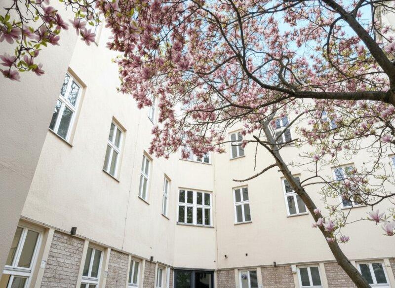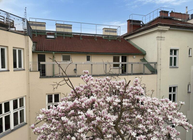 Hier genießen Sie absolute Ruhe mitten in der Stadt mit Blick in den begrünten Innenhof und einem wunderschönen Magnolienbaum, der für eine besonders angenehme, fast schon parkähnliche Atmosphäre sorgt.