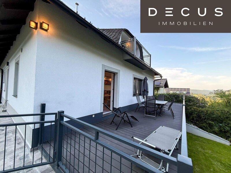 Von hier aus schweift der Blick über den eigenen Garten bis hinein in die dichten Baumkronen des Wienerwaldes. Keine unmittelbaren Nachbarn, keine störenden Einblicke nur Grün in all seinen Facetten.