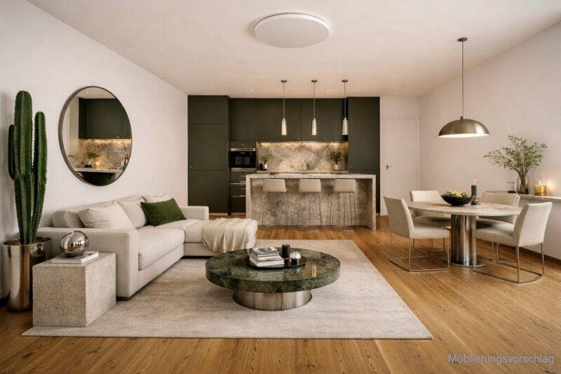 großzügiger, lichtdurchfluteter Wohn-Essbereich mit Südost-Ausrichtung