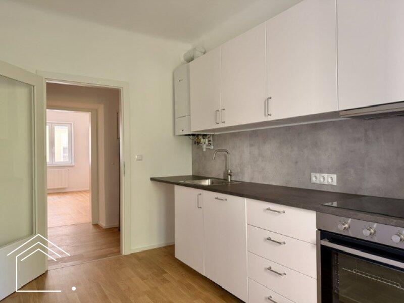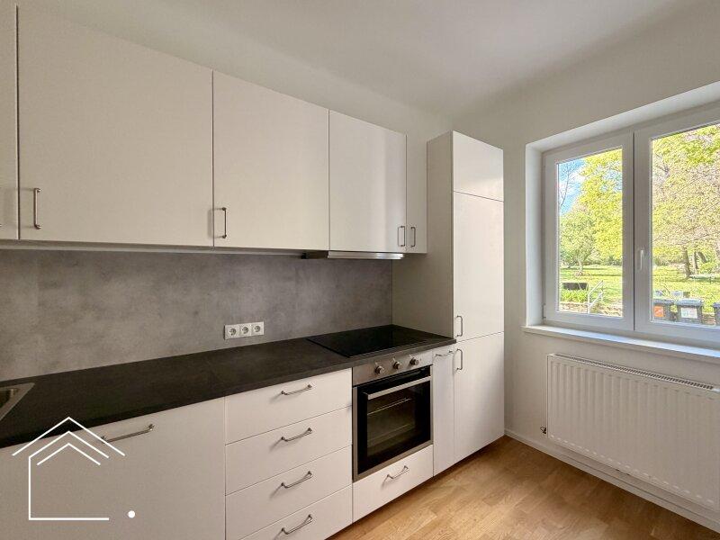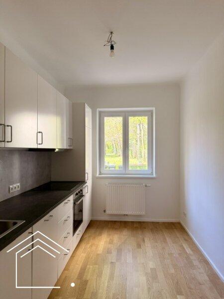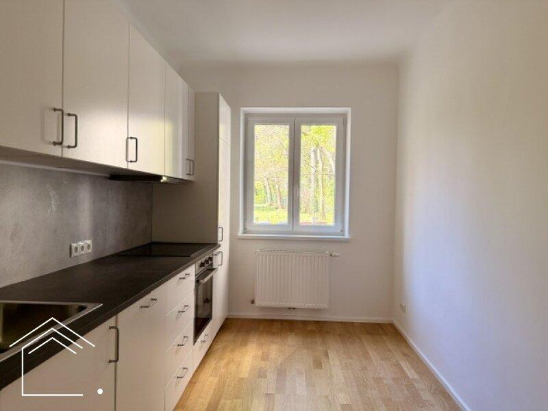 Vom zentralen Vorzimmer gehen straßenseitig die beiden geräumigen und hellen Zimmer ab, in Richtung Garten die ansprechende Küche, komplett ausgestattet mit Herd, Backrohr, Geschirrspüler, Kühl-/Gefrierschrank, sowie ausreichend Ober- und Unterkästen. Das elegante Badezimmer ist mit Dusche, Waschtisch und Toilette ausgestattet.
