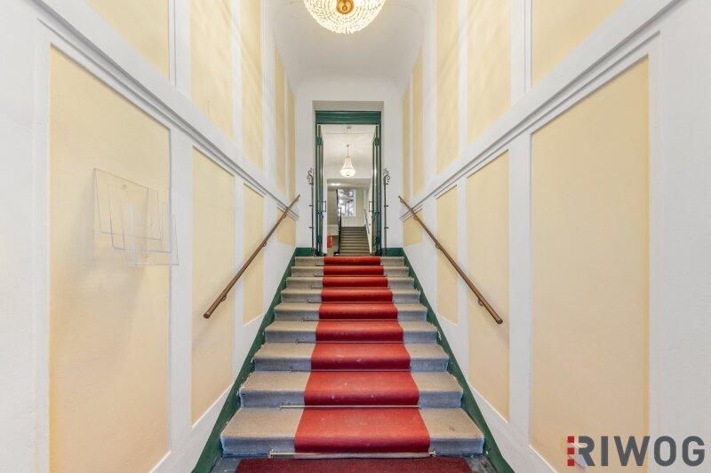 Die Wohnung liegt im 2. Stockwerk (zzgl Hochparterre) eines gut erhaltenen Zinshauses und teilt sich wie folgt auf: