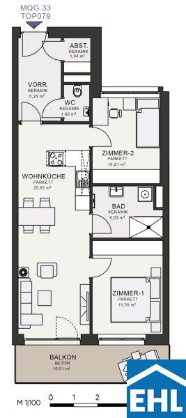 Das MQG wird als siebengeschossige bis zehngeschossige Hofstruktur realisiert und überzeugt durch eine hochwertige architektonische Umsetzung. Die vier Baukörper sind jeweils zweihüftig organisiert und über großzügige, bis zu acht Meter breite Längsatrien erschlossen, die als kommunikative Begegnungszonen dienen. Dank transparenter Glasüberdachungen sind diese Bereiche wettergeschützt und gleichzeitig lichtdurchflutet, wodurch eine angenehme Atmosphäre entsteht. Zudem ermöglicht dieses Konzept eine optimale Querlüftung aller Wohnungen.