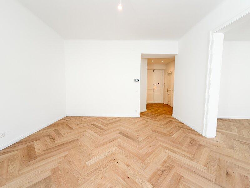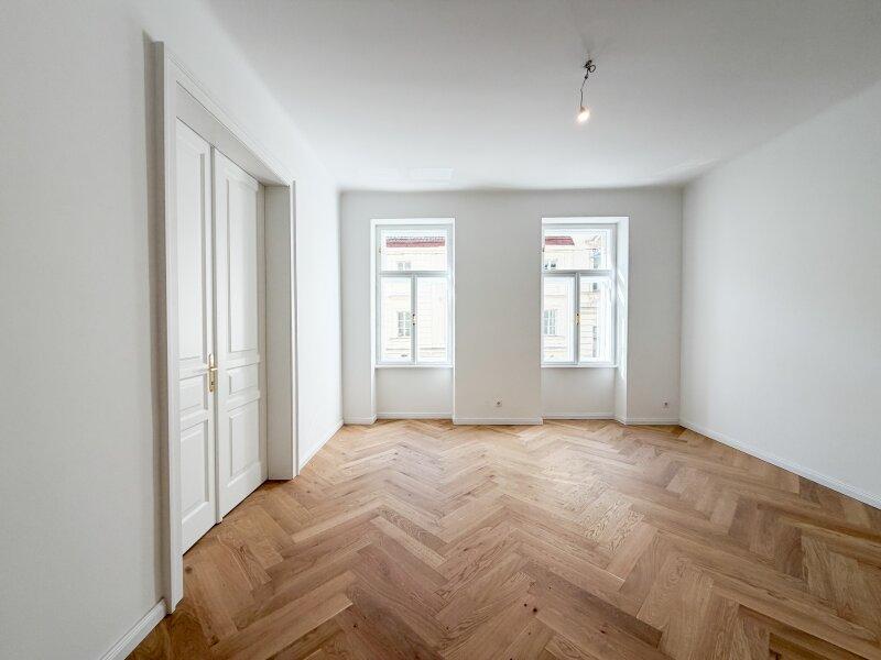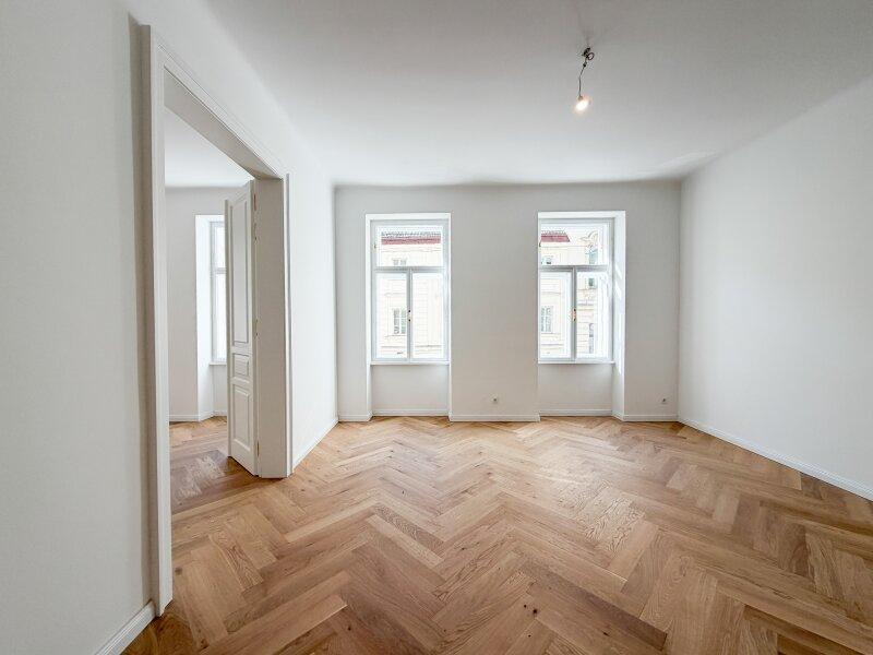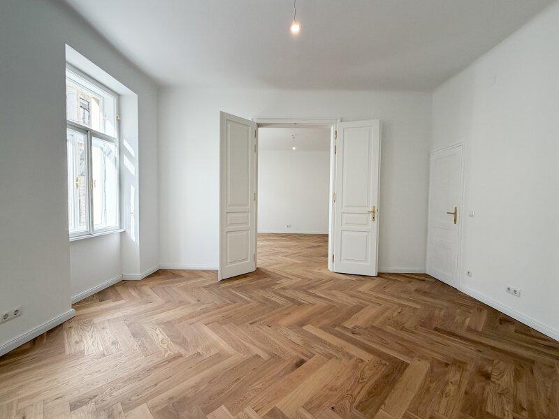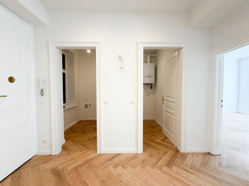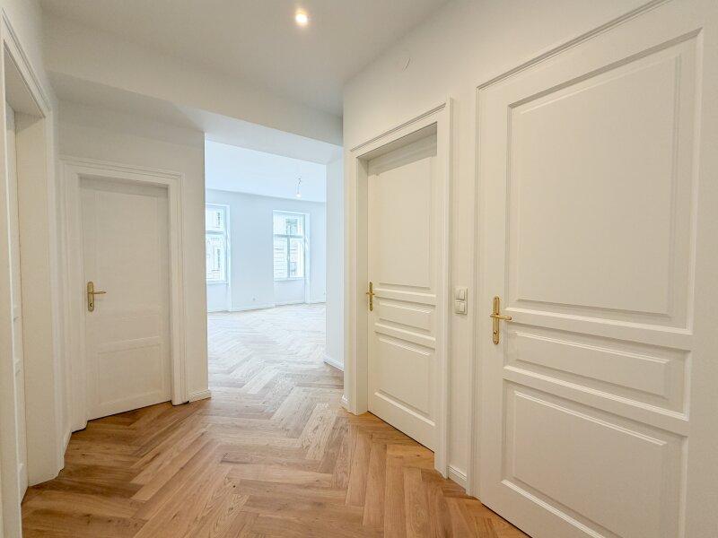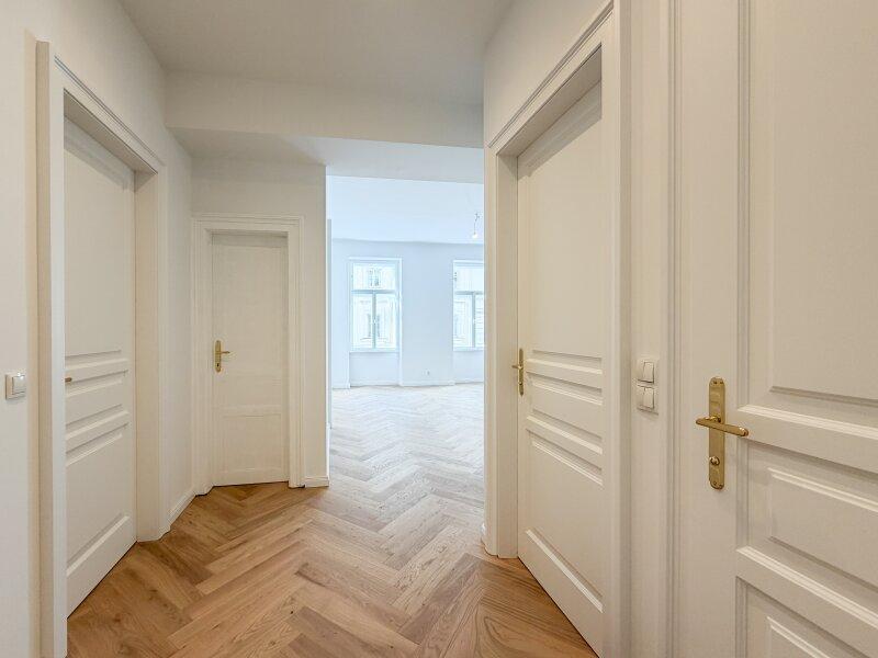 Die wunderschön restaurierten Wiener Kastenfenster, elegante Flügeltüren und neue Türen im klassischen Alt-Wiener Stil verleihen der Wohnung ihren unverwechselbaren Charakter.