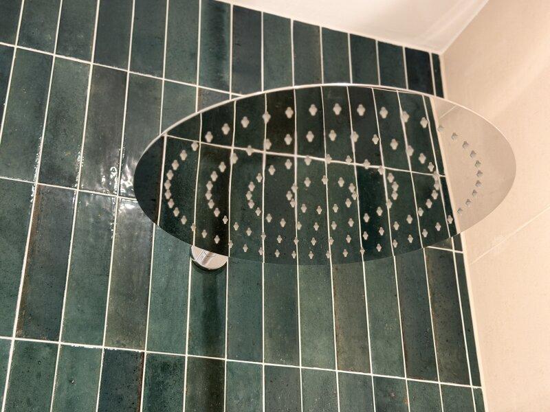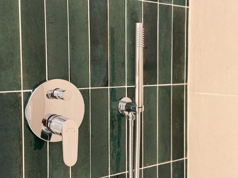 • stilvolles Highlight: edle, dunkelgrüne Fliesen als Akzentwand im Duschbereich