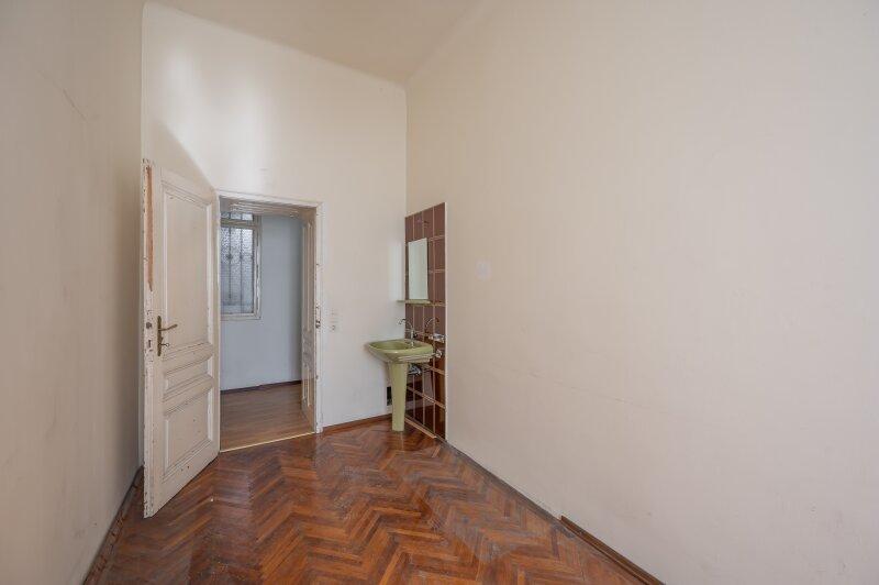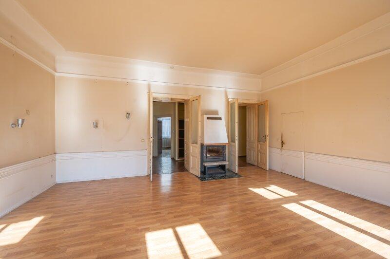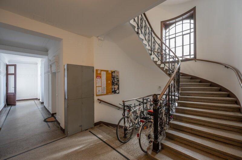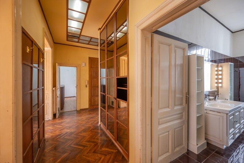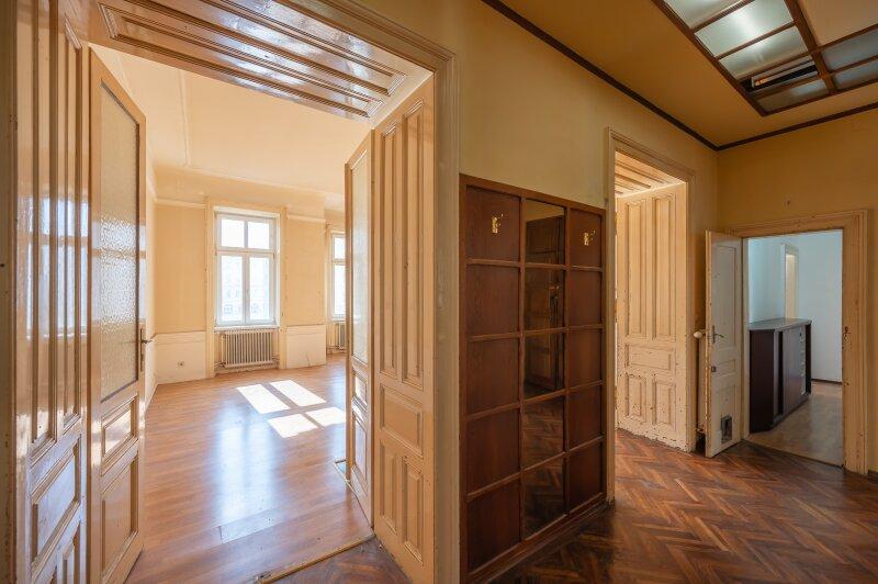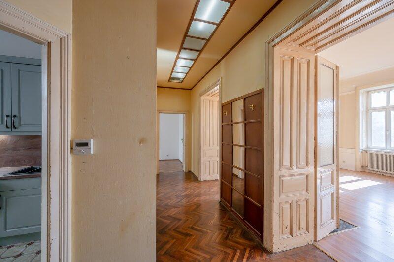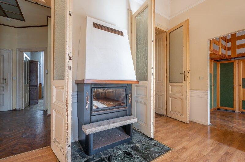 Die Wohnung befindet sich im 2. Stock (ohne Lift) und in einem sanierungsbedürftigen Zustand. Sie bietet sehr viele Elemente eines Stilaltbaus: