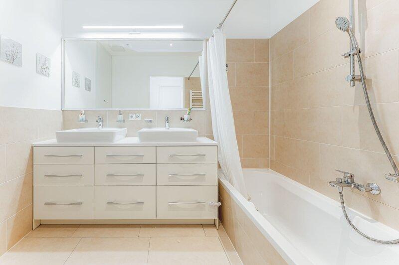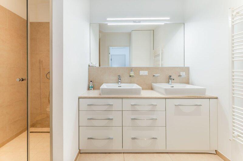 Die Wohnung verfügt über insgesamt drei Schlafzimmer. Zwei der Zimmer sind ideal als Kinder- oder Gästezimmer geeignet und bieten jeweils Zugang zu eigenen Außenflächen (Balkon bzw. Terrasse). Das Master-Bedroom überzeugt mit einem eigenen Badezimmer en-suite sowie einem separaten WC und bietet somit höchsten Wohnkomfort. Ergänzt wird das Raumangebot durch ein weiteres, großzügiges Badezimmer mit Doppelwaschbecken, Badewanne und WC sowie einen praktischen Schrankraum.