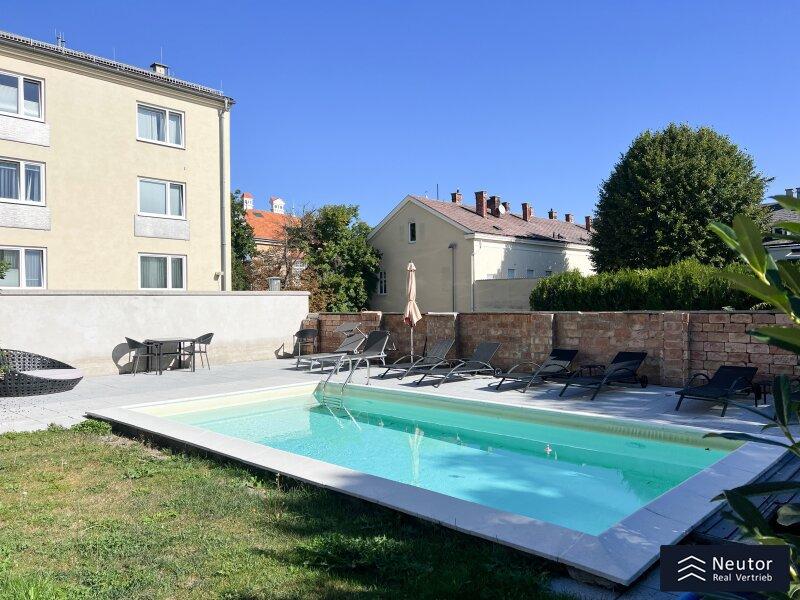 In einer exklusiven Lage direkt im Villen Cottage, umgeben von Ruhe und Parkanlagen werden Sie an dieser Adresse empfangen. Das Haus wurde in den letzten Jahren aufwendig saniert und befindet sich in einem guten Allgemeinzustand. Über das Stiegenhaus gelangen Sie in den 3. Stock (Hochparterre + 2), von wo Sie nicht mehr weit von Ihrem Wohnprojekt entfernt sind. Die Wohnung bietet helle Räume und einen wunderschönen Ausblick auf den Gemeinschaftspool. Dieser eignet sich besonders gut an heißen Sommertagen. Aktuell stehen Ihnen zwei separate Räume zur Verfügung, wobei sich einer davon im Rohbau befindet. Die Küche können Sie in einem extra Raum platzieren oder daraus eine große Wohnküche gestalten. Die Dusche befindet sich momentan in der Küche - eine nachträgliche Schaffung eines Badezimmers wäre jedoch möglich. Das WC befindet sich praktischerweise separat. Ein Balkon könnte errichtet werden, da die Zustimmung aller Wohnungseigentümer vorliegt. Auf diesem können Sie Ihren Kaffee am Morgen genießen. Geplant ist der Balkon mit einer Größe von rund 8,8 m². Zwei eigene nebeneinander liegende Parkplätze direkt vor der Türe müssen zusätzlich zur Wohnung erworben werden. Eine tolle Wohnung in einer exklusiven Lage, welche nach Sanierung wieder im vollen Glanz erstrahlen kann. Die Wohnung bietet Freiraum für begeisterte Hobby Architekten.