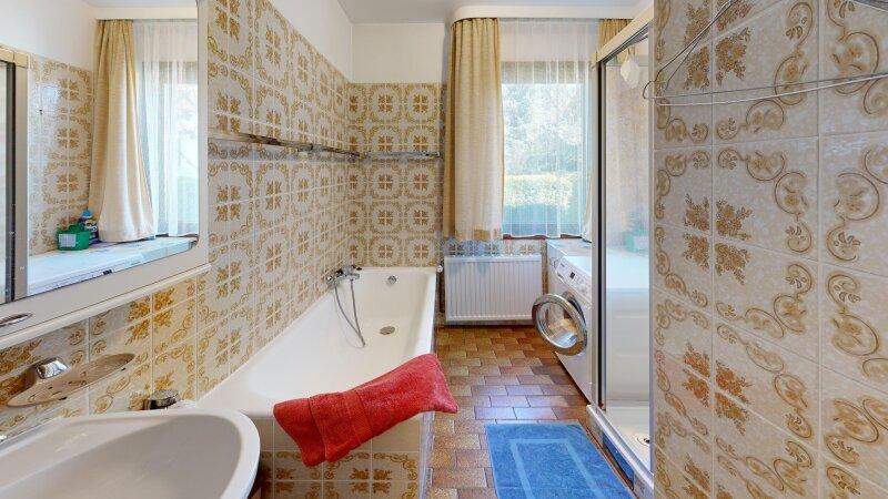 Badezimmer mit Badewanne, Dusche und Fenster