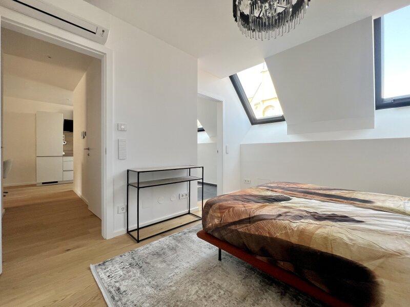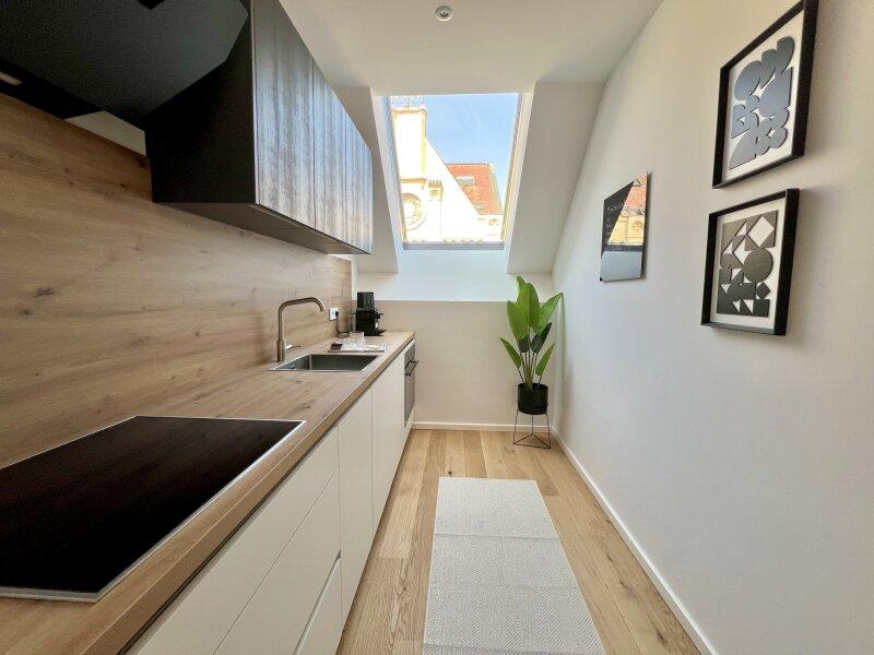 Der Zwei-Zimmer-Erstbezug befindet sich im 1. Dachgeschoß und verfügt über ca. 74 qm Wohnfläche und einen hofseitigen Balkon mit ca. 8 qm auf Wohnebene.