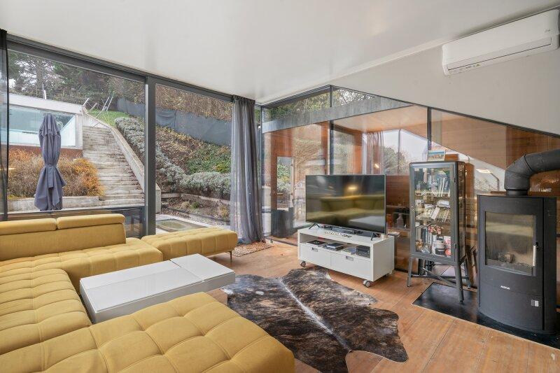 Eine Ebene darüber befindet sich der Wohnbereich mit ca. 23 m², ausgestattet mit einem Kaminanschluss, der eine außergewöhnlich behagliche Wohnstimmung verspricht.
