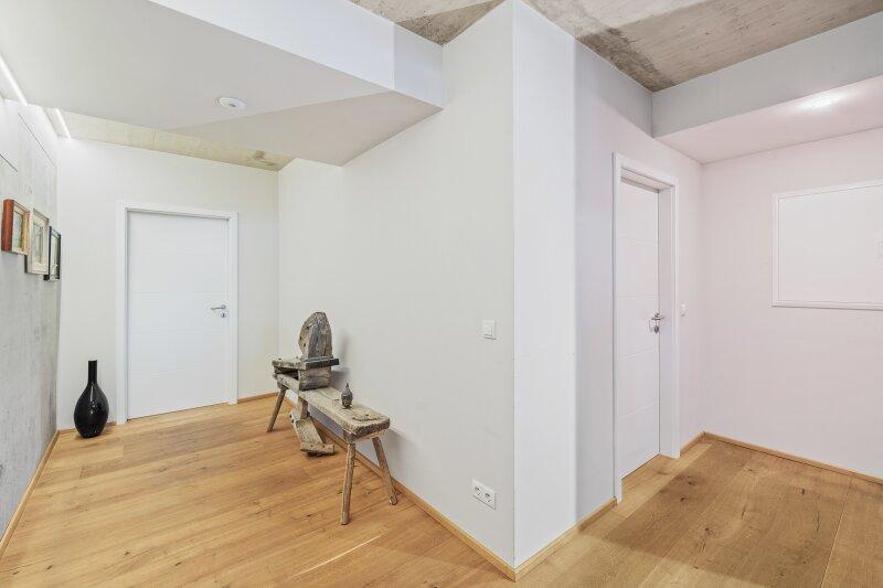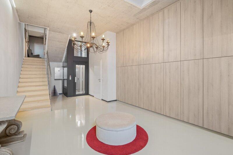 Im Inneren des Hauses empfängt Sie ein großzügiges, rund 30 m² großes Entrée, das mit einem maßgefertigten, raumhohen Einbauschrank beeindruckt und ein Höchstmaß an Funktionalität sowie Eleganz bietet.