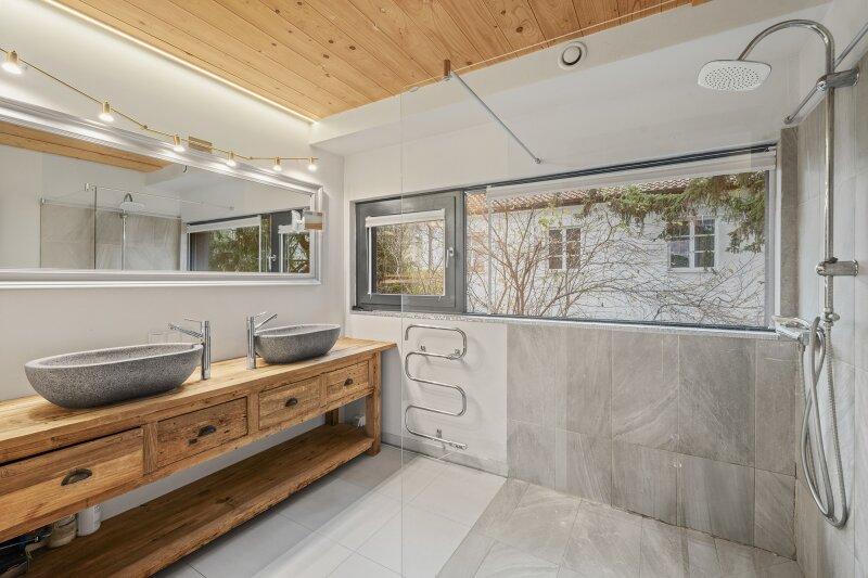 Hier befindet sich ein modernes Badezimmer mit ebenerdiger Dusche und Doppelwaschbecken, das höchsten Komfort bietet. Eine separate Toilette ergänzt diesen Bereich.