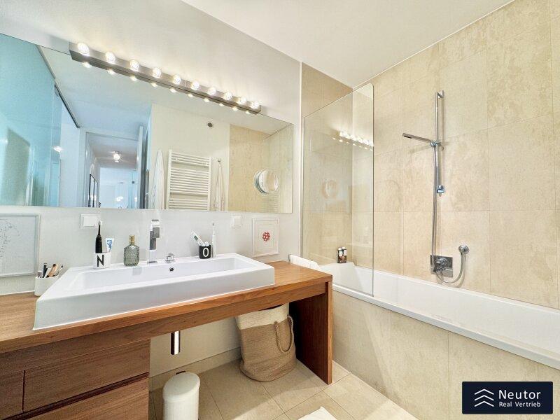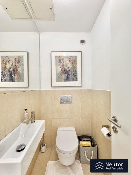 Fußbodenheizung sorgt für angenehme Wärme, während die vorbereitete Klimaanlagen-Leerverrohrung bereits an warme Sommertage denkt. Eine kontrollierte Wohnraumlüftung versorgt die gesamte Immobilie stets mit Frischluft. Das edel ausgestattete Badezimmer mit Badewanne lädt zum Entspannen ein, während durchdachte Details wie ein separater Abstellraum mit WM-Anschluss und ein zusätzliches WC den Alltag mühelos machen.