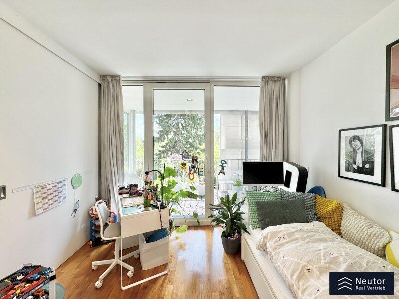 Ein echtes Highlight ist die ca. 16 m² große, südseitige Loggia auf Wohnebene: Hier genießen Sie Sonne von morgens bis abends und blicken in einen liebevoll gepflegten Garten mit altem Baumbestand eine seltene Kombination aus Privatsphäre, Ruhe und Natur, mitten in der Stadt.