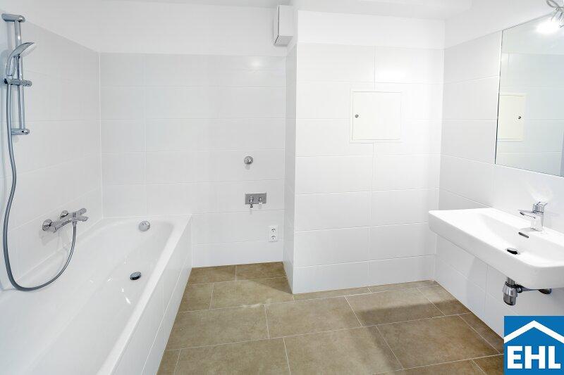 - Moderne Bäder mit Badewanne und Waschmaschinenanschluss.