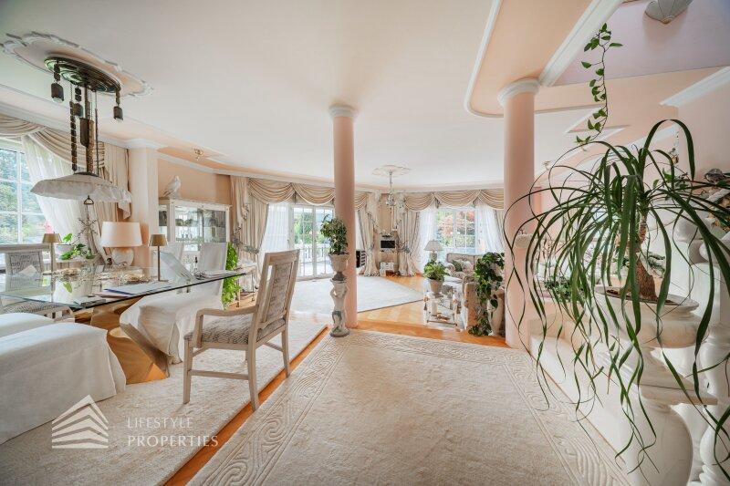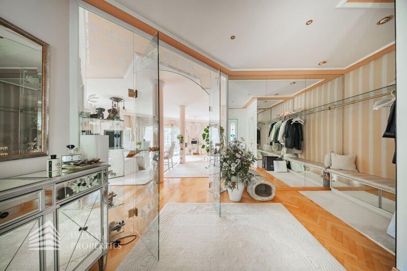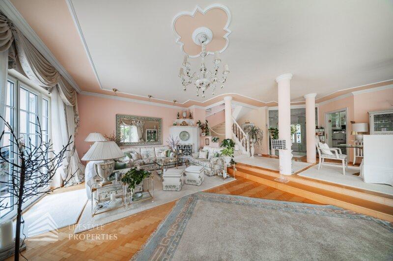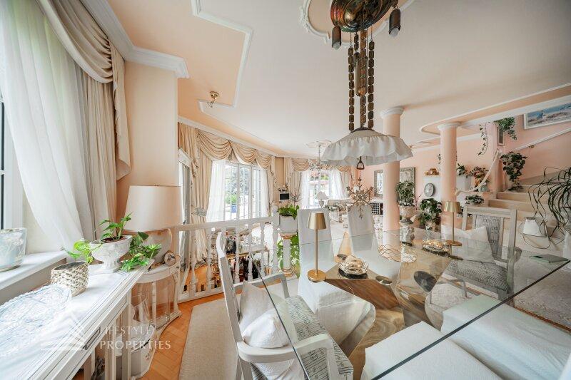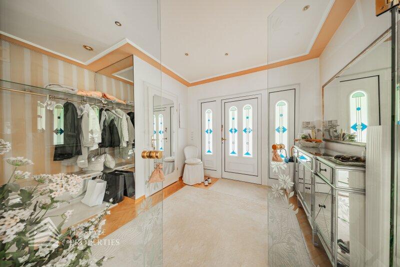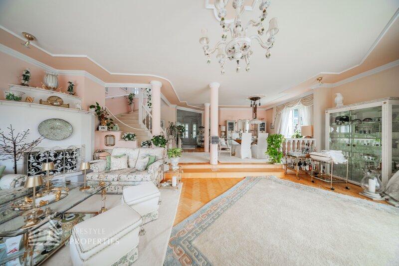 Beim Betreten der Villa befindet man sich direkt im Vorraum, diese mit einer großzügigen Garderobe und einen Windfang aus Glas ausgestattet ist. Rechts vom Eingang befindet sich die Toilette. Durch die Glastüre erreicht man den Essplatz und den exklusiven Wohnbereich mit seiner faszinierenden Ausstattung und den offenen Kamin, dieser durch zwei Stufen, mit edlen Säulen verbunden ist und durch die vielen Glasfronten und den Türen zur Terrasse mit viel Tageslicht durchflutet ist.