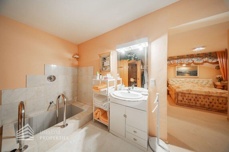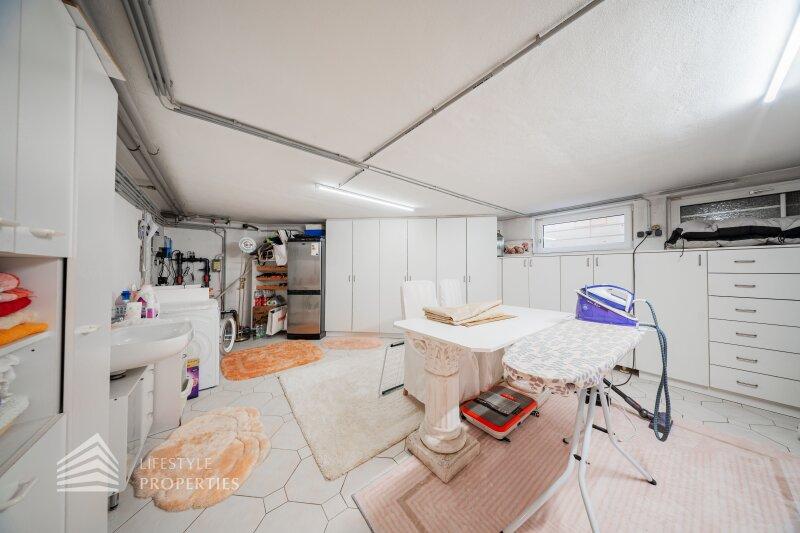 Des Weiteren verfügt die Villa über einen Wohnkeller, wo sich das Gästezimmer und der Wellnessbereich befindet. Ausgestattet mit einer finnischen Sauna und ein Kältebecken, einer Dusche, einen Waschbecken und einer separaten Toilette. Nebenan erreicht man den Wirtschaftsraum und Technikraum.