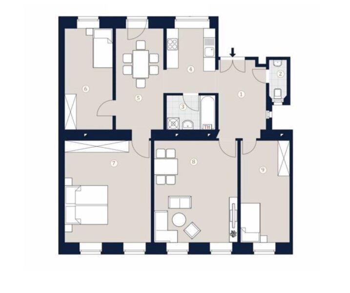 Die durchdachte Anordnung der Räume sorgt für eine klare Trennung von Wohn- und Ruhebereichen und macht die Wohnung sowohl für Familien als auch für Wohngemeinschaften besonders attraktiv.