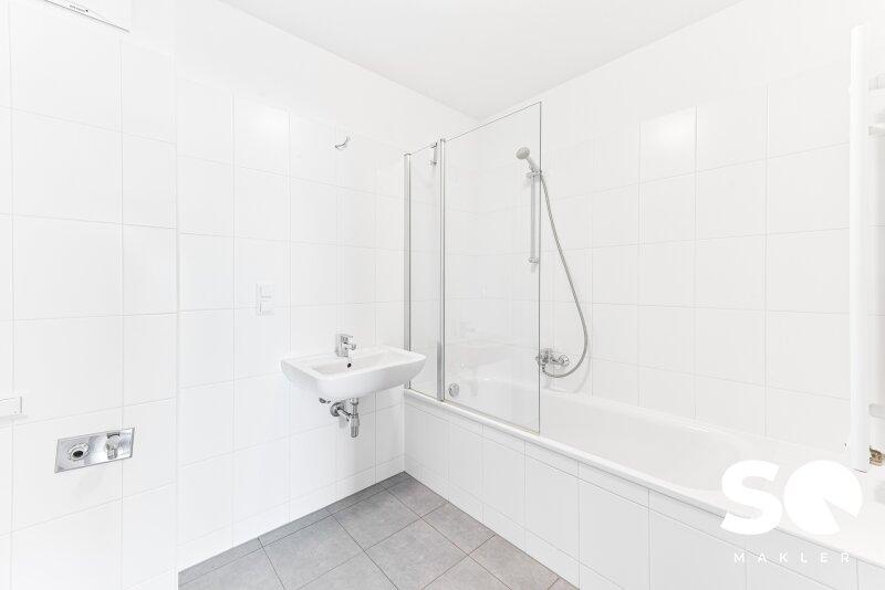 Mit Badewanne, Waschbecken und Waschmaschinenanschluss.