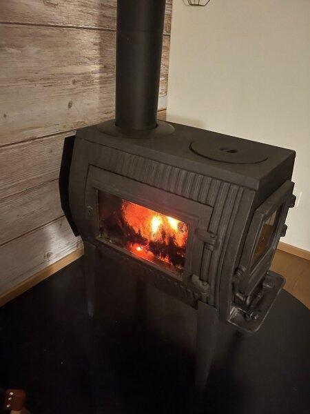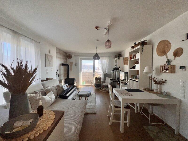 Der helle, großzügige Wohnbereich bildet das Herzstück der Wohnung und lädt zum Entspannen ein. Ein hochwertiger Kaminofen (7 kW) schafft nicht nur eine besonders behagliche Atmosphäre, sondern bietet mit integrierter Herdplatte auch ein Plus an Unabhängigkeit ideal in Zeiten steigender Energieunsicherheit.