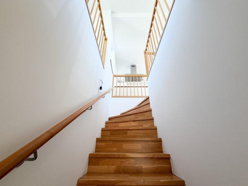 Über eine charmante Holztreppe gelangt man in die weitläufige Wohnküche ein zentraler Treffpunkt mit viel Raum für Alltag und besondere Momente. Die Kombination aus offenen Flächen, Dachschrägen und großen Fensterfronten sorgt für ein Wohnambiente, das sich angenehm von klassischen Grundrissen abhebt.