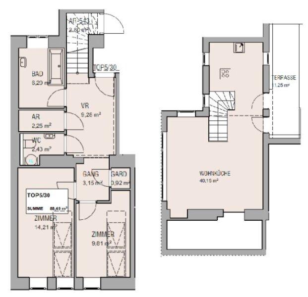 - Wohnfläche: ca. 88,49 m² auf zwei Ebenen