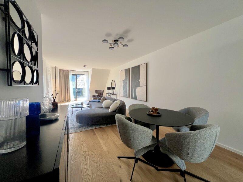 Der Zwei-Zimmer-Erstbezug befindet sich im 1. Dachgeschoß und verfügt über ca. 74 qm Wohnfläche und einen hofseitigen Balkon mit ca. 8 qm auf Wohnebene.