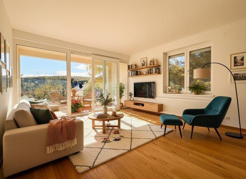 Hinweis: zur Illustration und Inspiration wurde das Titelbild virtuell mit KI eingerichtet. Die Wohnung wird bis auf die maßangefertigte Tischlerküche unmöbliert verkauft.